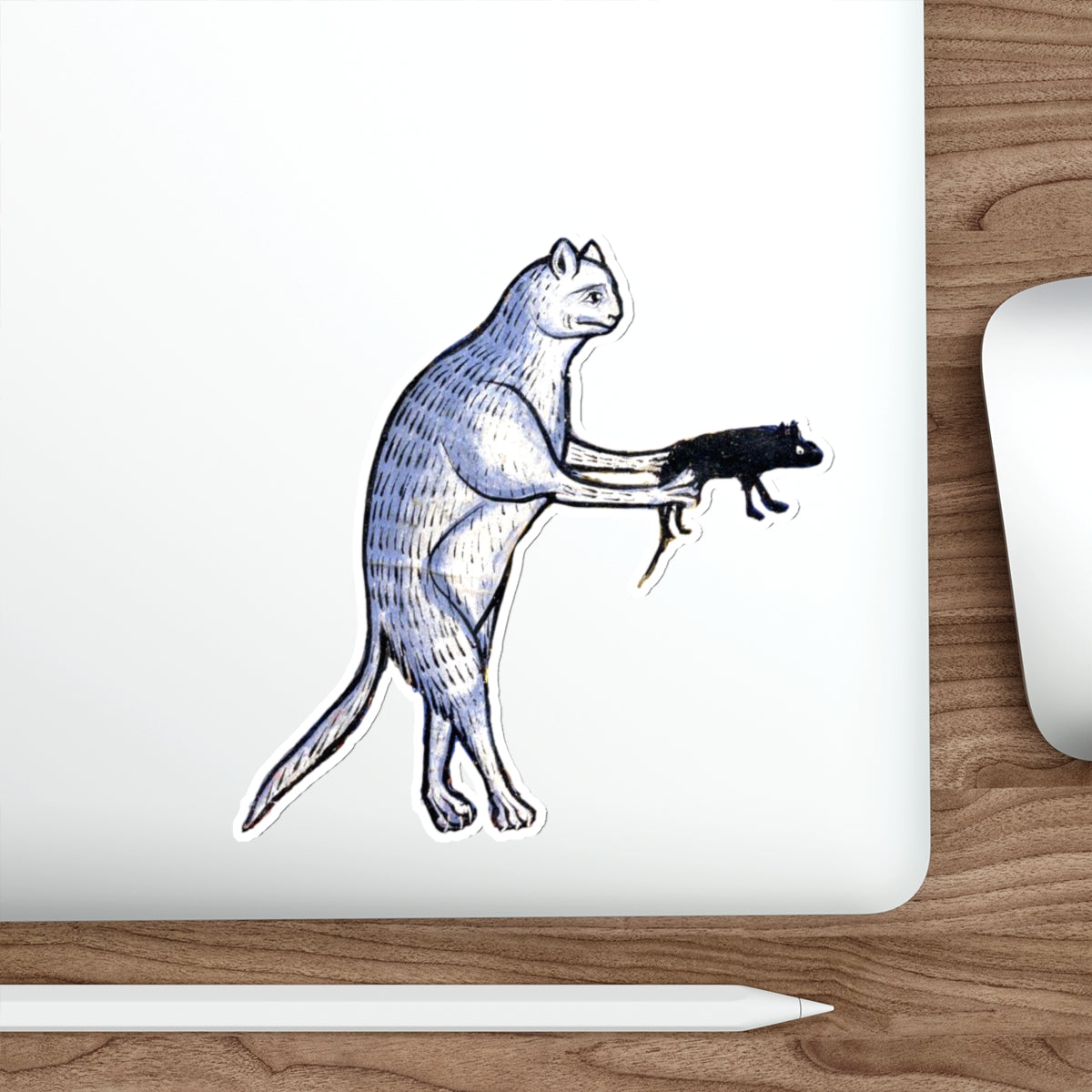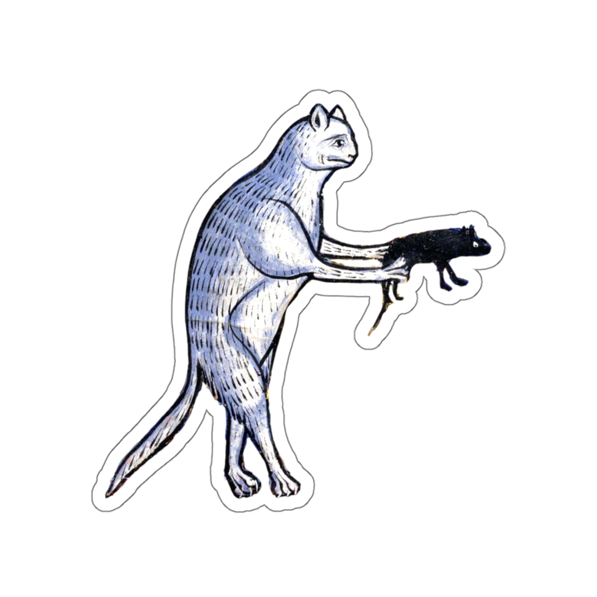 This unique sticker features a medieval illustration of a cat standing upright while holding a small creature (perhaps a mouse or another cat!) in its paws — an odd, whimsical scene straight from the margins of a medieval manuscript.