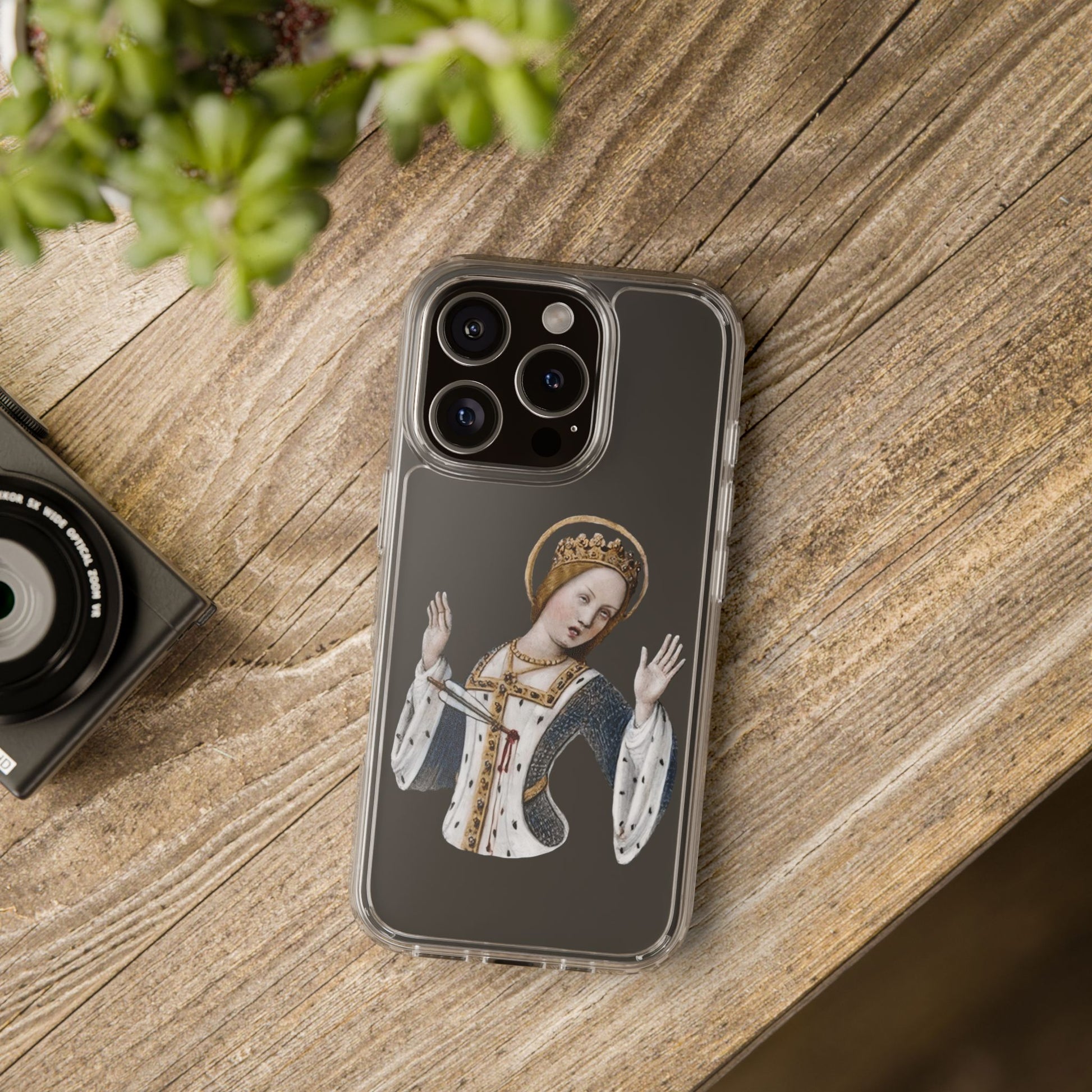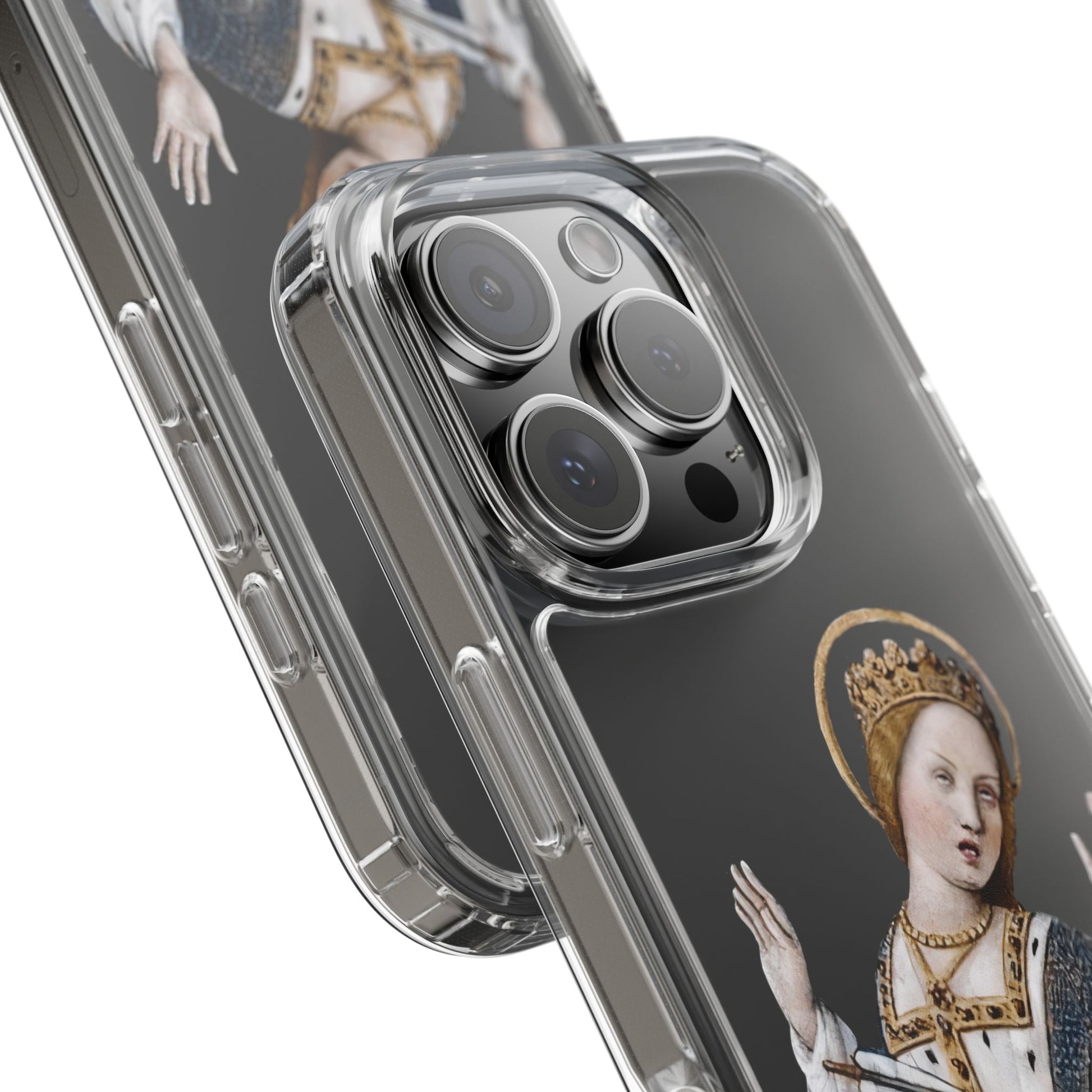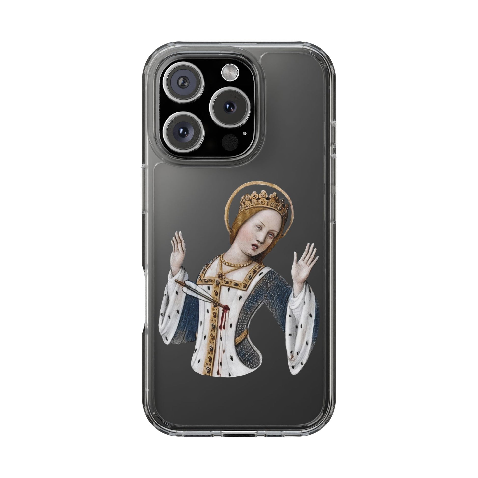 Regal. Wounded. Deeply unimpressed. This medieval queen has been through it — literally stabbed and still somehow more done with your nonsense than ever. Lifted from an illuminated manuscript and immortalised on a phone case, she serves side-eye and martyr energy in equal measure.