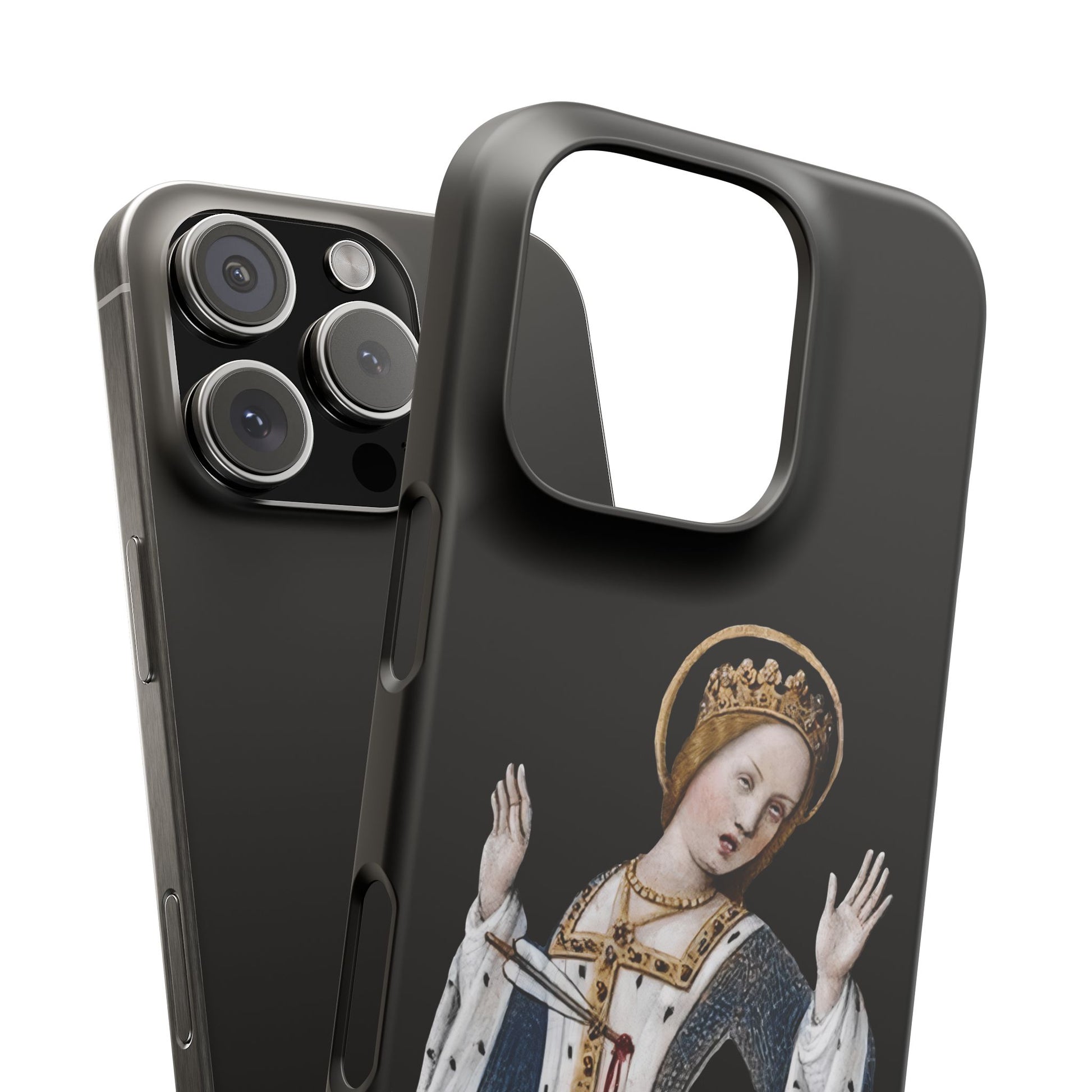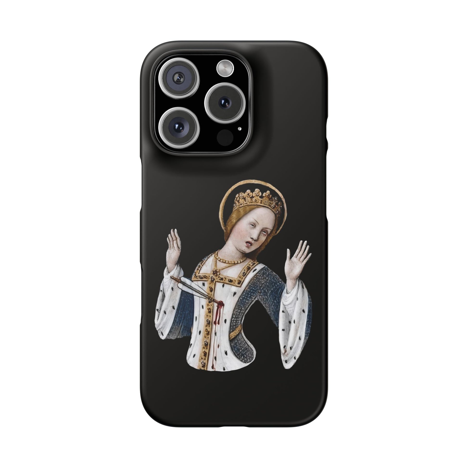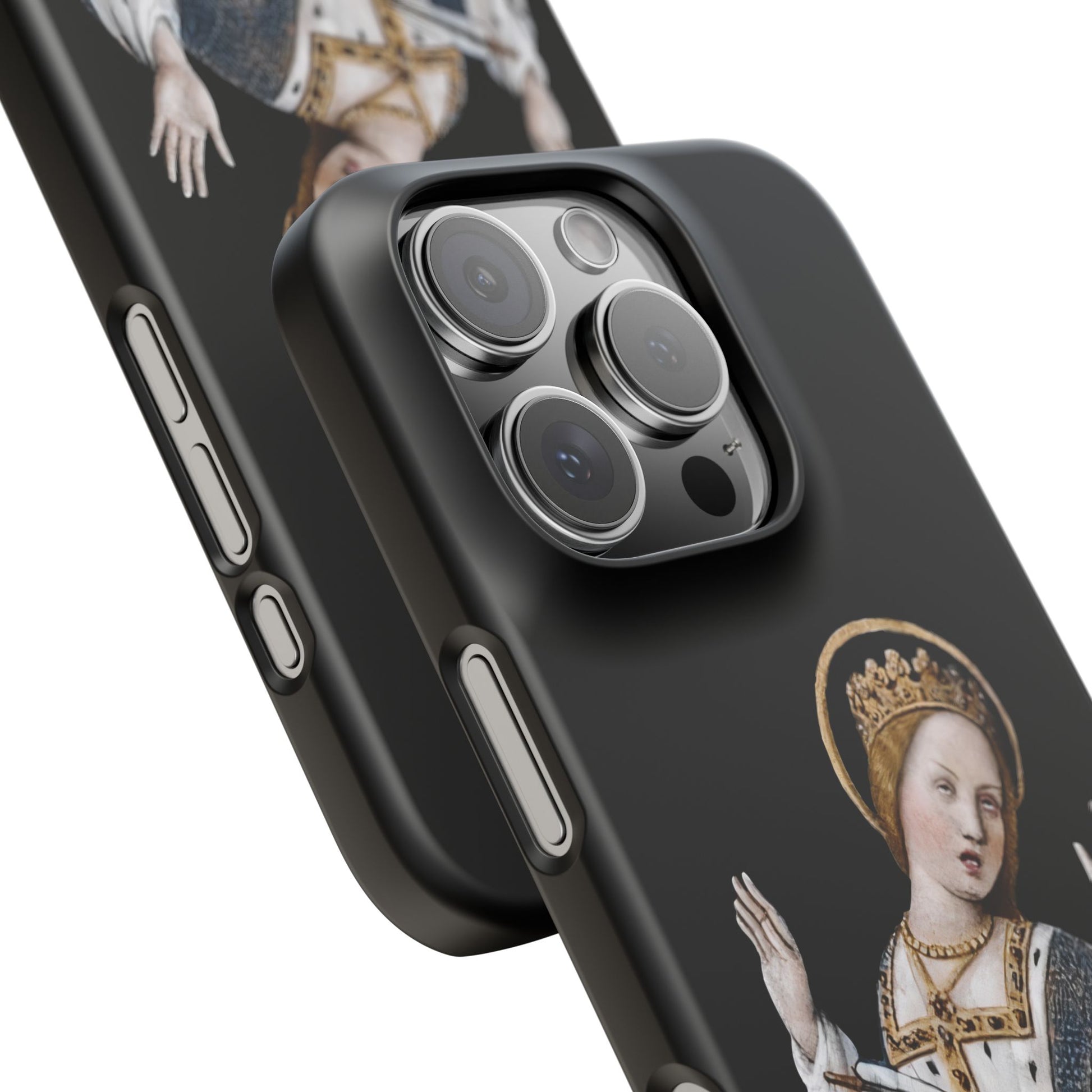 Regal. Wounded. Deeply unimpressed. This medieval queen has been through it — literally stabbed and still somehow more done with your nonsense than ever. Lifted from an illuminated manuscript and immortalised on a phone case, she serves side-eye and martyr energy in equal measure.